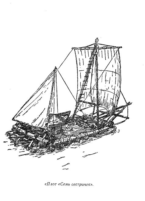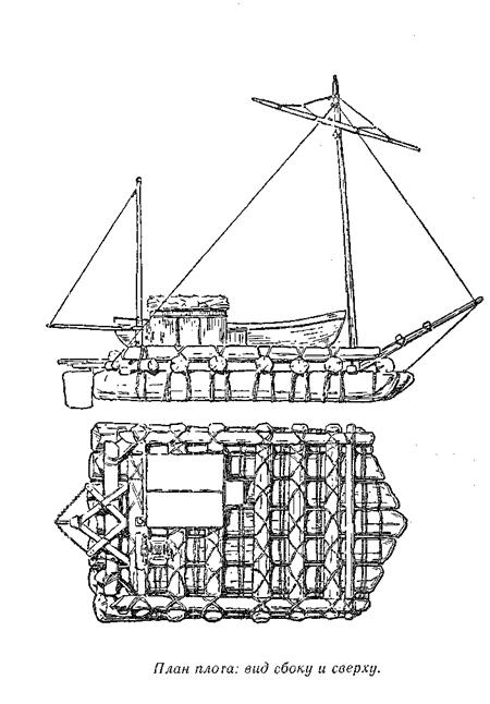 Для связывания бревен я применял нолуторадюймовый манильский канат. Каждая связка скрепляла только два бревна, образуя восьмерку. Это значило, что каждая связка независима от остальных и, если одна из них разойдется или канат перетрется, другие от этого не пострадают. Скрепляя бревна, я всякий раз применял прямые узлы — самый простой и древний способ связывания. Должен сказать, что я делал связки не на равном расстоянии друг от друга, а сообразуясь с формой бревен. Чтобы бревнам было «удобно» во время путешествия, я связывал их в таком же положении, в каком они лежали на воде, когда их сплавляли вниз по рекам Паланке и Гуайяс, — мне хотелось быть в самых добрых отношениях с моими «Семью сестричками».
